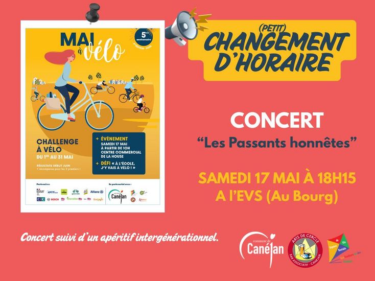 Petit changement d'horaire pour le Concert des "Passants honnêtes" prévu samedi 17 mai à 18h15 (et non 18h30), à l'EVS "Les Couleurs du Jeu", en partenariat avec le Cercle de Canéjan !