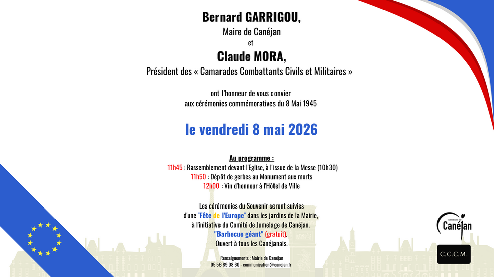 À l’occasion de la commémoration de la Victoire du 8 mai 1945, la Ville de Canéjan et l’association des "Camarades Combattants Civils et Militaires" vous invitent à participer aux cérémonies organisées le vendredi 8 mai 2026 :